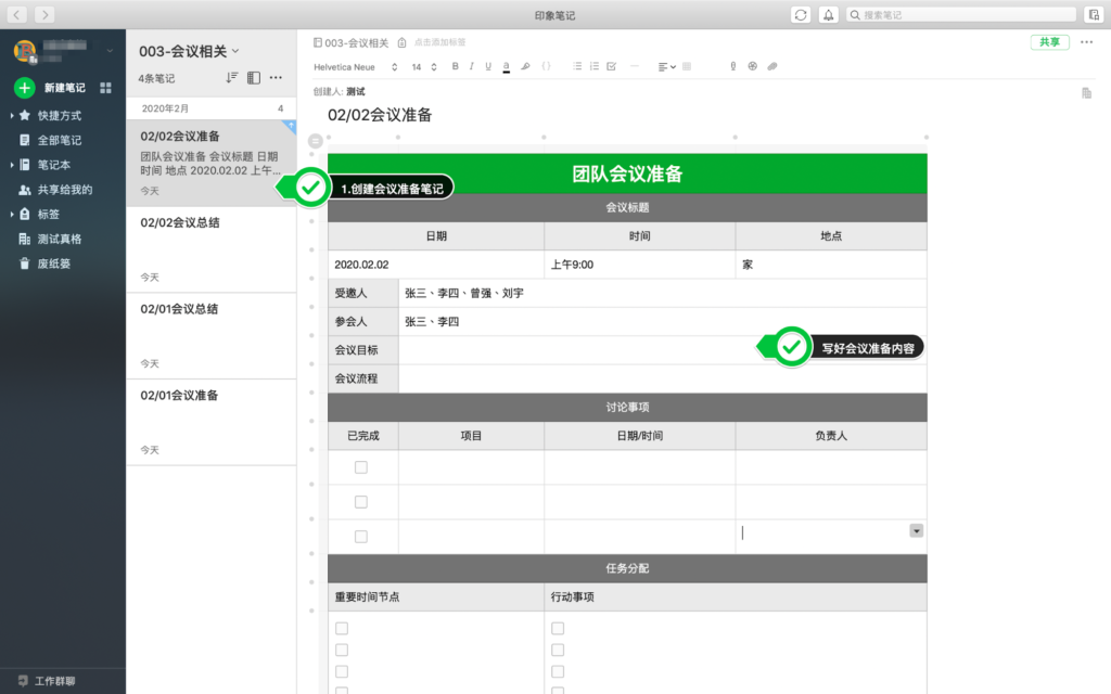 团队成员加入笔记本后,可以根据会议需求,在会前使用「团队会议准备」模板制定会议相关的基本信息,并将笔记共享给所有与会人员,请大家提前了解会议内容。