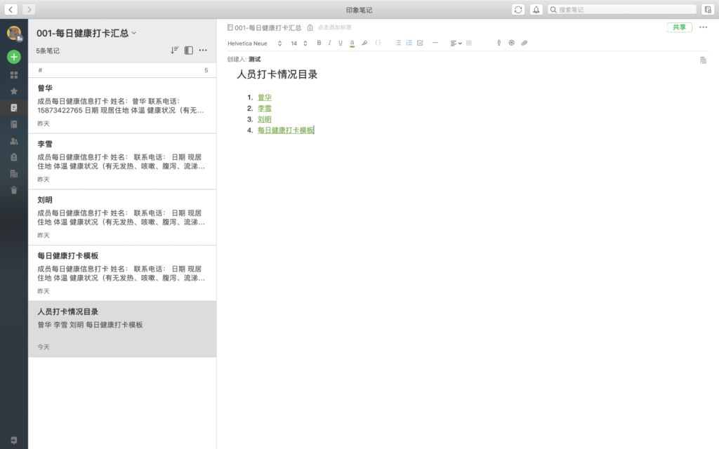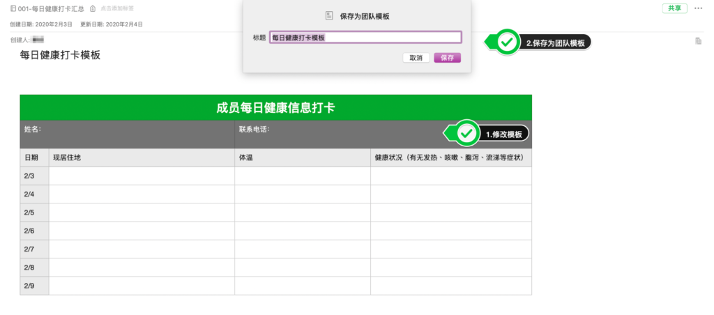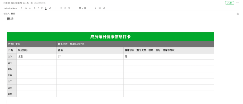 定制完团队专属模板后,管理员就可以开始创建团队健康管理信息库了。你可以新建一个「每日健康打卡汇总」笔记本,并共享给团队的所有成员,设置为可编辑权限。方便每个人在笔记本中做健康打卡,更高效地汇总团队健康信息。