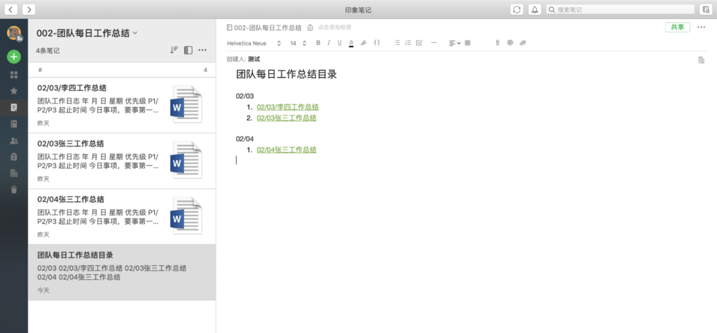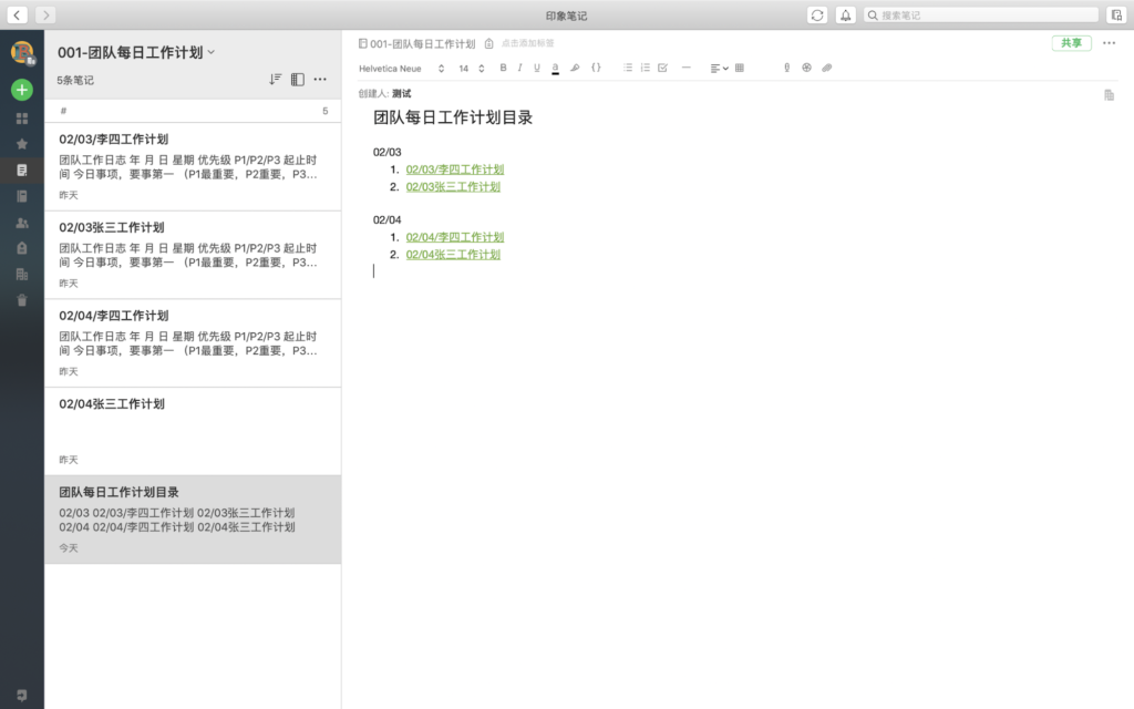 定制完团队模板,管理员再新建一个「团队工作规划」笔记本,并邀请所有团队成员加入笔记本,在笔记本中与大家共享每日工作规划和工作成果了。