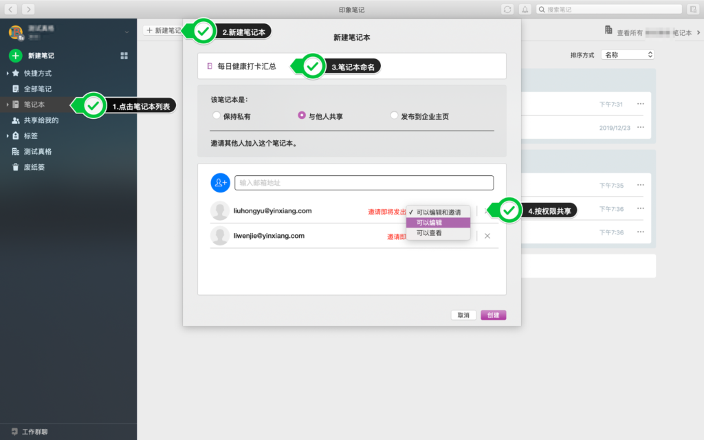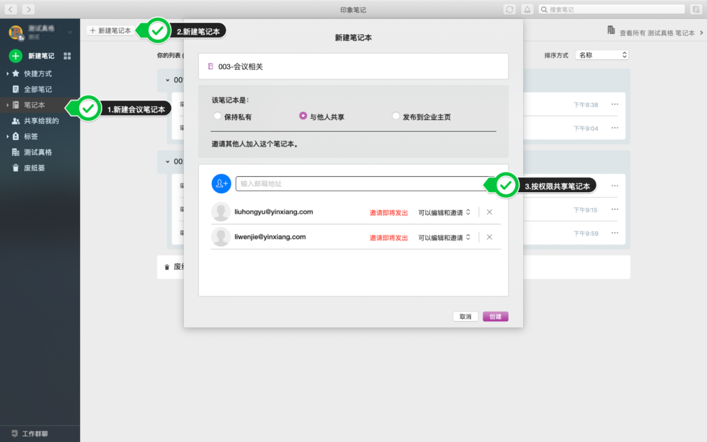 然后由管理员为团队创建「会议记录」笔记本,并邀请所有团队成员加入,并根据团队成员的身份设置不同的权限。