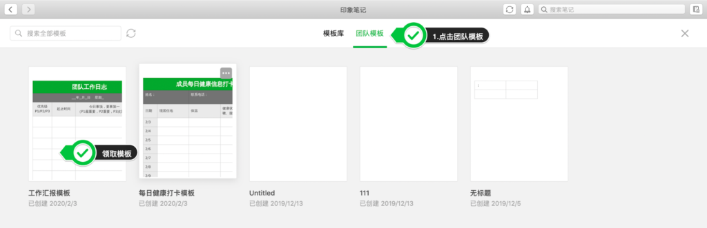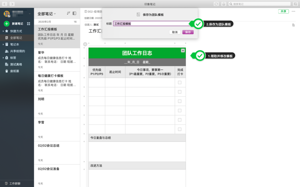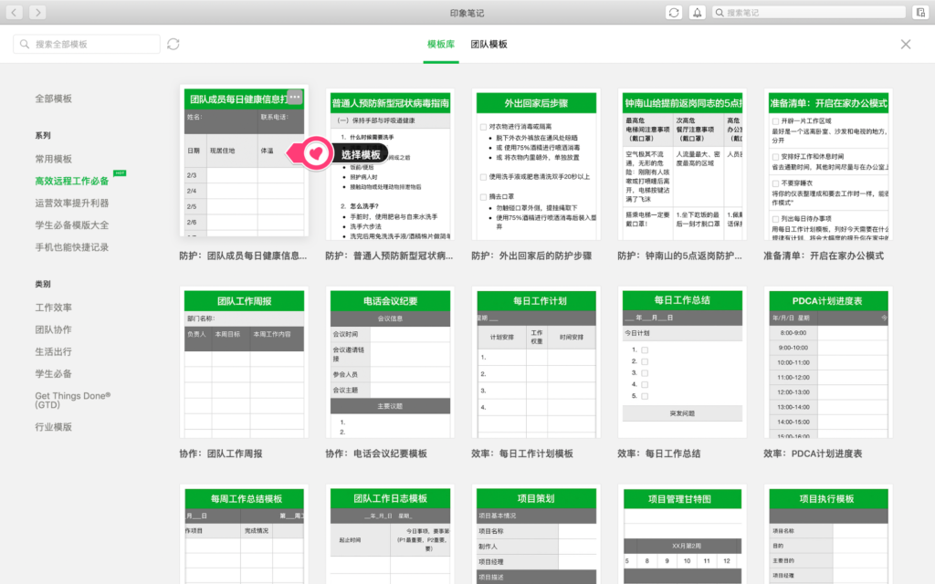 管理员选取适合团队需求的模板。「高效远程工作必备」系列模板(点击领取)已经在印象笔记官方模板库中全新上线,囊括「健康防护」、「效率提升」、「远程协作」和「项目管理」等多种类型的模板内容。企业管理员可以根据团队的需求选取「团队成员每日健康信息打卡」等适用的模板保存为团队模板,方便团队成员一键取用。