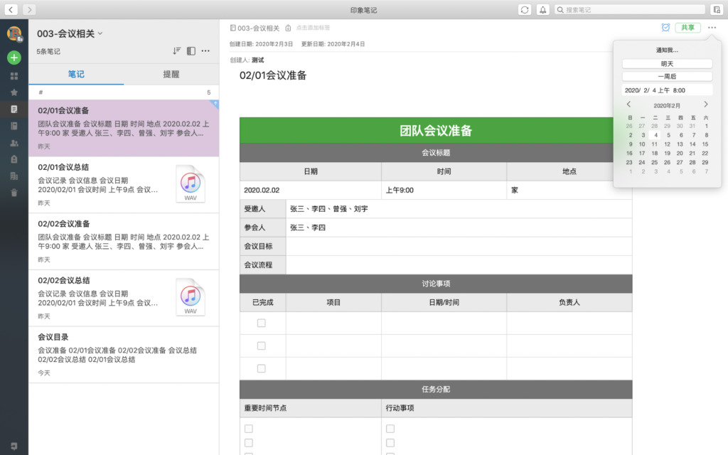 最后为「会议准备」笔记添加时间提醒,确保与会人员准时参加。