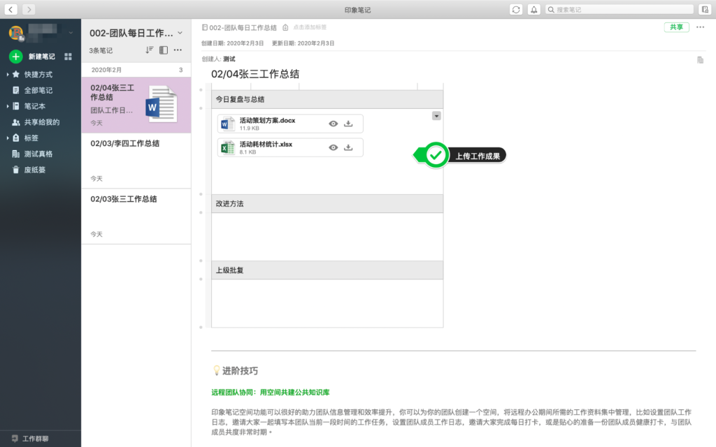 团队成员加入笔记本后,首先在团队模板库中领取模板,然后按照模板规则填写自己的每日工作规划、上传工作成果,及时完成每日的计划和汇报。